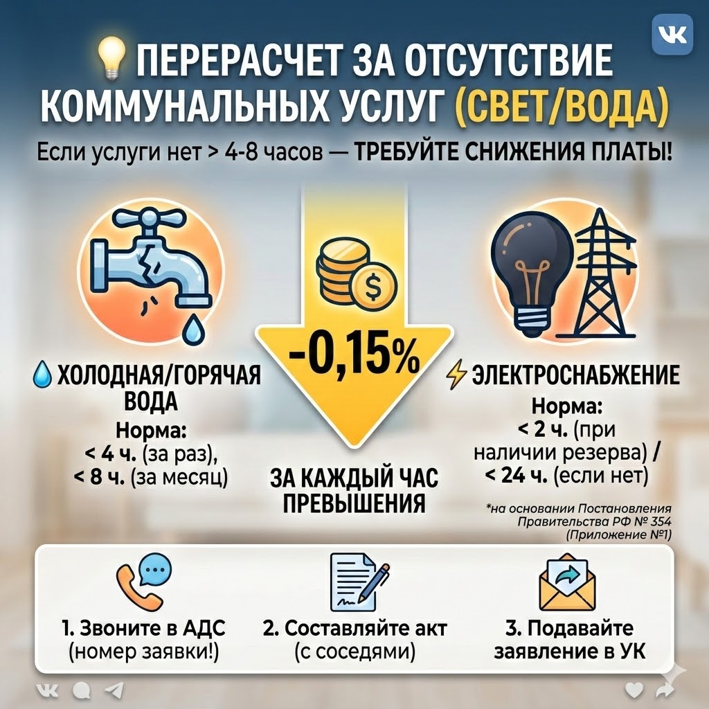 Знакомая ситуация? Приходите домой после работы, хотите принять душ или просто включить чайник, а в кране — сухо, а в розетке — тишина. Мы привыкли вздыхать, ругаться на «коммунальщиков» и ждать. А в конце месяца послушно оплачивать квитанцию на полную сумму, будто услуга оказывалась безупречно. Стоп. Давайте изменим этот сценарий. У вас есть законное право не платить за услуги, которые вам не предоставили. И это не «копейки», а вполне ощутимая экономия, если знать, на что давить. Мало кто знает, но в Постановлении Правительства РФ №354 прописан штраф для управляющих компаний за каждый час, когда у вас не было воды, света или тепла сверх нормы. За каждый час «простоя» сумма в квитанции за конкретную услугу должна снижаться на 0,15%. Да, на первый взгляд кажется, что это немного. Но давайте посчитаем: если горячей воды не было сутки (24 часа) сверх допустимых норм, вы имеете право требовать перерасчет на 3,6%. А если аварии случаются регулярно? За месяц набегает приличная сумма, котору