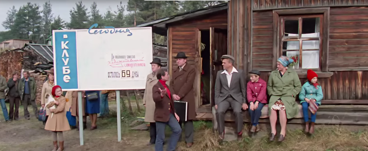 Ох, и весело в деревне у нас! Никто не печалится, не унывает. В центре, на площадке перед клубом, готовимся к районному смотру самодеятельности (до него остаётся шестьдесят девять дней. Согласно афише).