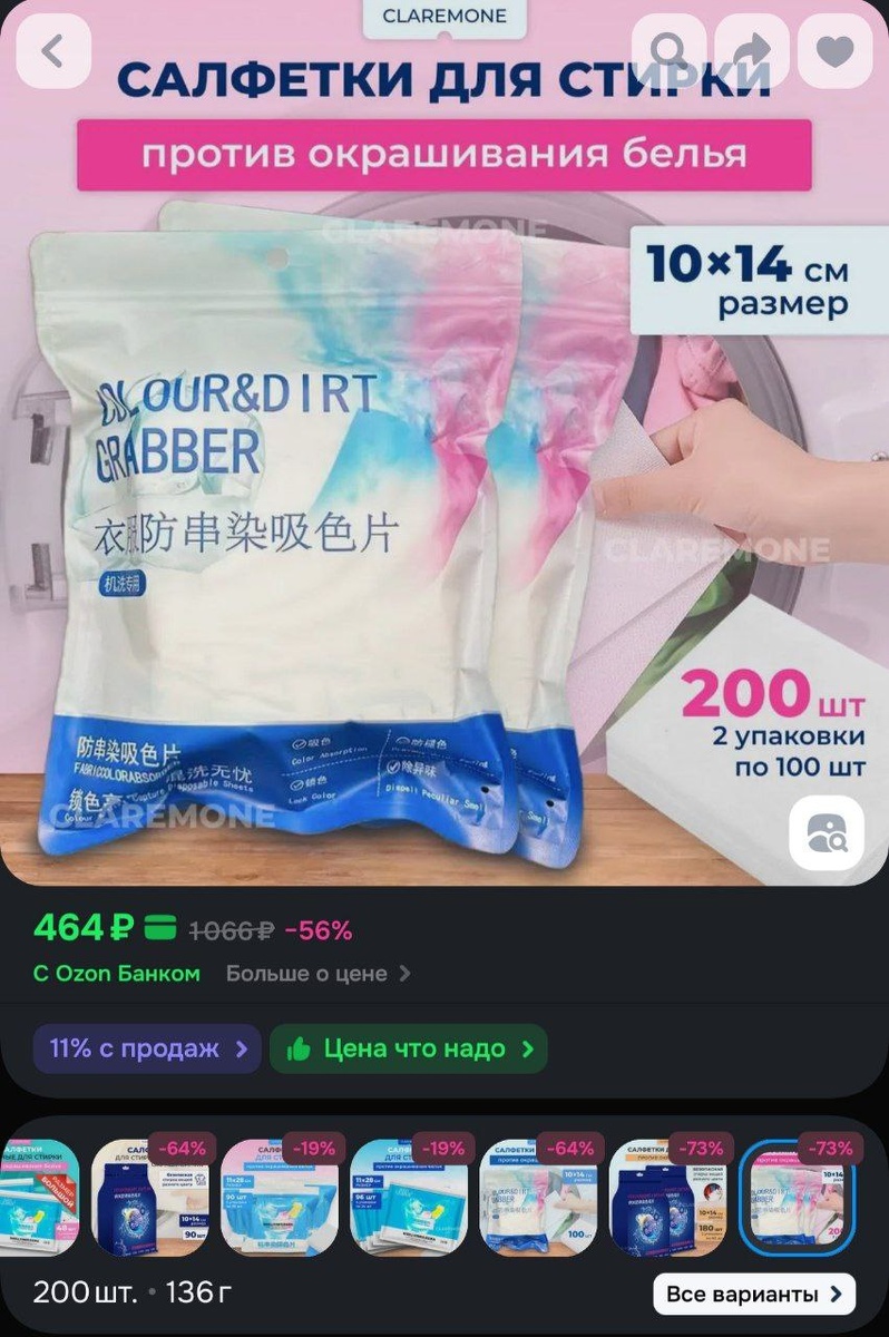 Салфетки для стирки Claremone против окрашивания белья, ловушка цвета, 200 шт. за 464₽