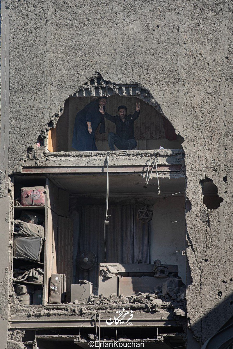 Среди этих развалин, среди разрушенных стен и пустых окон, видны двое иранцев. Не с усталыми и покорными лицами, а с тихой улыбкой на губах. Они подняли руки и машут фотографу; словно хотят сказать: мы всё ещё здесь, мы всё ещё стоим.