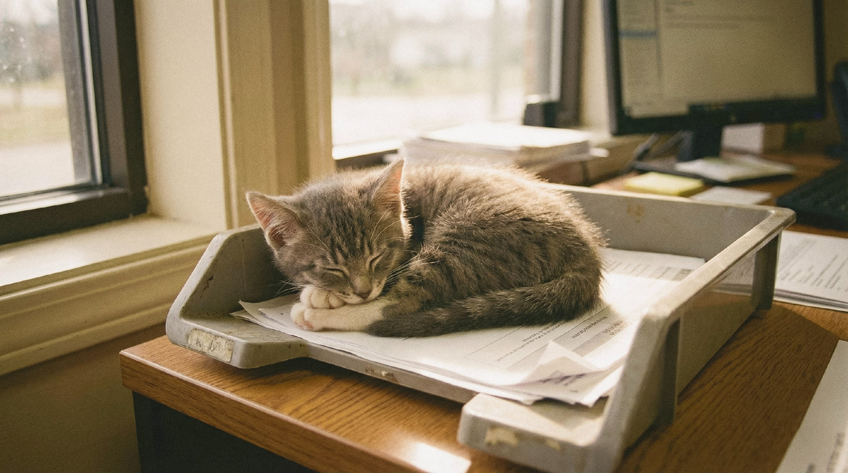 Котёнок лежал на её столе. В лотке для входящих документов - том самом, сером, пластиковом, куда складывали бумаги на подпись. Лоток стоял на углу стола, у окна. Солнце - редкое, ноябрьское - падало на него косым лучом.