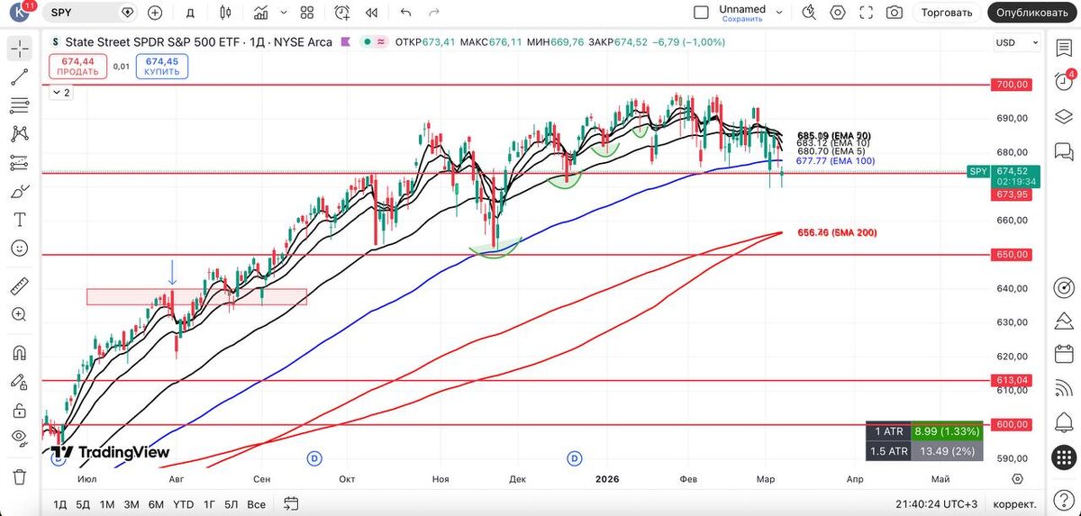 закончен, осталось 2 часа до закрытия). С другой стороны, техи $NQ1!, $MAGS, $IGV, $XLK сохраняют свои закономерности и символизмы, что означает, что техи могут начать показывать силу, а значит, рынок вверх. Это положительно скажется на $SPY, а к тому же наши позиции пока выглядят отлично — индивидуальная сила продолжает присутствовать, ничего не меняем, дадим рынку время. Также актуален сценарий спуска к 200 EMA D. По крипте ситуация такая же: попытка выйти наверх пока не увенчалась успехом, и цена вернулась в диапазон, где мы уже больше месяца торгуемся. Важно хотя бы для начала показать уважение быстрым скользящим, чтобы затем можно было очень быстро преодолеть скользящие сверху + топливо хорошее собралось для этого. Рынок продолжает испытывать нас, и чем дольше, тем интереснее будет дальше 😌 Всем отличных выходных 😎 #spy #технический_анализ #америка #трейдинг_сша #фондовый_рынок #обзор #вывод #qqq #vix #smh #mags #xlk #ixic #крипта #btc