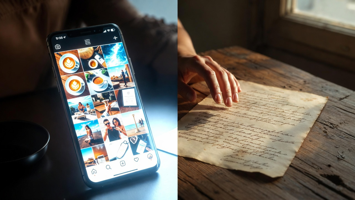 С одной стороны — экран айфона последней модели, глянцевый, яркий, полный отфотошопленных картинок и пустых слов. С другой — пожелтевший треугольник, исписанный неровным почерком, со следами слёз (или дождя?) на бумаге.