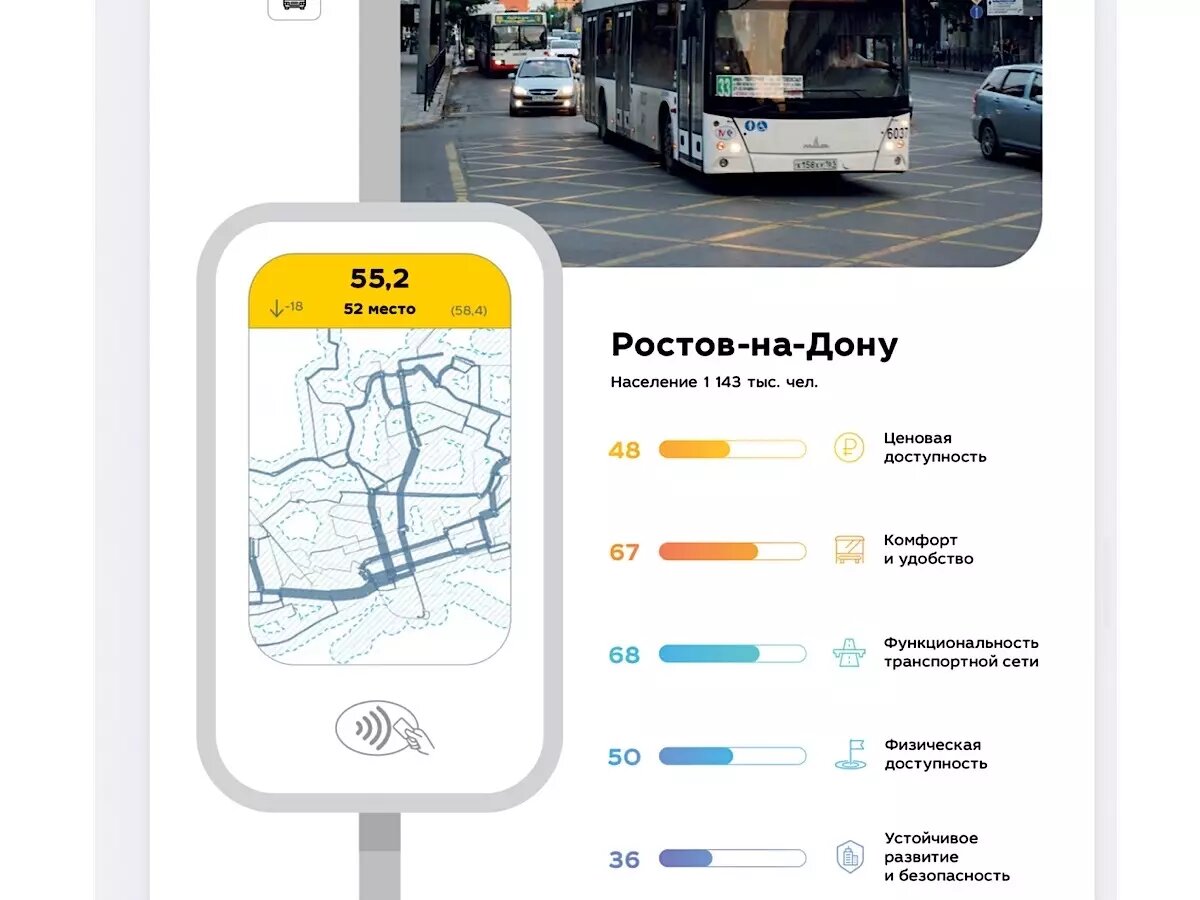 Ростов-на-Дону оказался на 52-й строчке в списке городов России по качеству общественного транспорта. Рейтинг был составлен специалистами SIMETRA (центр компетенций в области моделирования транспортных потоков и транспортного планирования) по данным на конец четвертого квартала 2025 года. По сравнению с 2022 годом донская столица опустилась вниз на 18 позиций. Эксперты анализировали по пяти параметрам. Ценовая доступность общественного транспорта в донской столице была оценена на 48 баллов. Проезд на автобусе недавно был повышен до 48 рублей. В итоге за две поездки людям приходится отдавать 100 рублей, если посчитать за месяц — это три тысячи рублей на одни только поездки. Доступности и комфорту дали 67 баллов. В эту характеристику входят вариативность тарифных планов и удобство использования транспортной карты, а также полнота и доступность сведений о функционировании транспортной системы. Эффективность транспортной системы (её способность обеспечивать передвижение) оценили на 68 балл