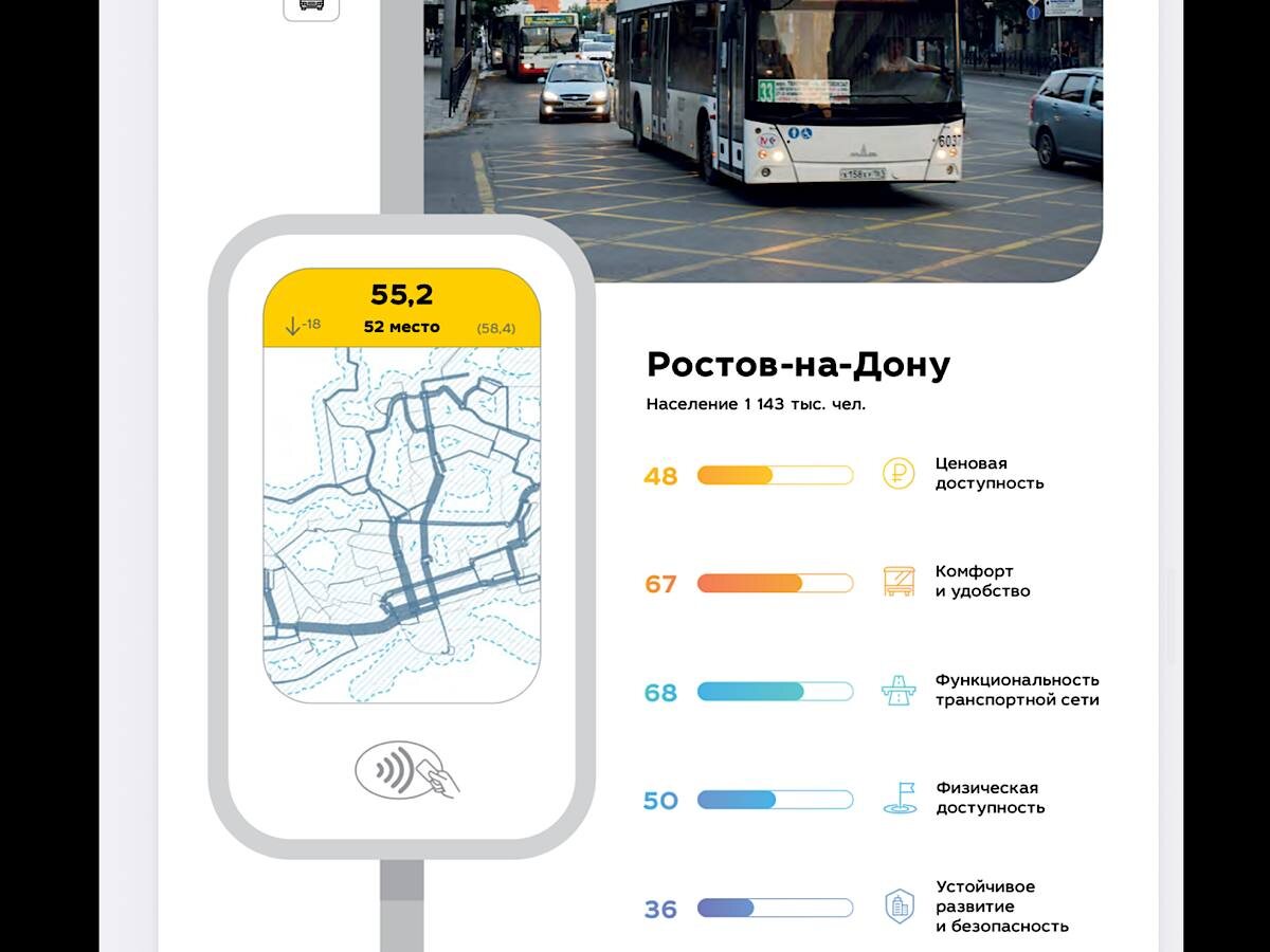 Рейтинг был составлен специалистами SIMETRA (центр компетенций в области моделирования транспортных потоков и транспортного планирования) по данным на конец четвертого квартала 2025 года. По сравнению с 2022 годом донская столица опустилась вниз на 18 строчек. В целом по качеству транспорта Ростов имеет 55,2 балла из 100. В прошлом году эта цифра была 58,4. Эксперты отметили, что город миллионник не просто остался на прежнем уровне, но и начал терять позиции в этой области. Специалисты оценивали следующие показатели: ценовую доступность, качество и удобство, функциональность транспортной сети, физическую доступность и устойчивое развитие и безопасность Подробнее читайте в материале.