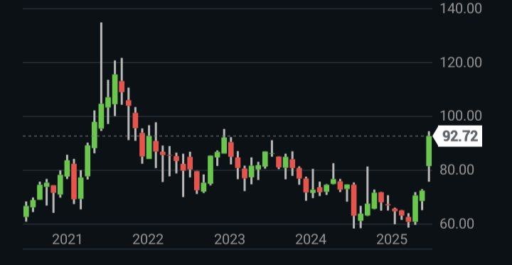 С начала года нефть Brent подорожала в полтора раза. Вот как выглядит пятилетний график. Так что, возможно, ещё не вечер.