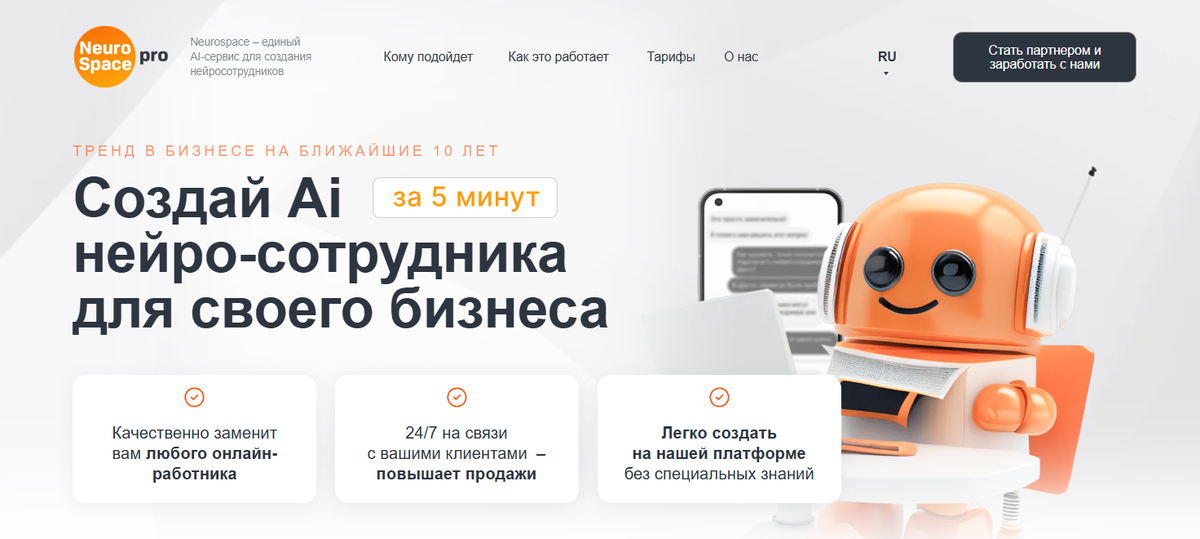 Один из таких ботов – Neurospace. Он использует продвинутый ИИ, благодаря чему может консультировать и вести клиента по воронке продаж так же эффективно, как и живой профессиональный менеджер. Только Neurospace работает круглосуточно, без выходных, и не устаёт.
