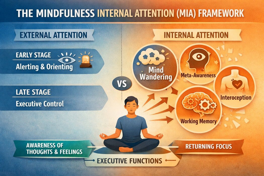 Тренировка внимания из роскошного максимума становится базовым минимумом. На возросшее количество отвлечений жалуются даже те, кто мог по 6 часов работать не вставая со стула. Одним из таких методов является практика осознанности - майндфулнесс. Но какой тип внимания она тренирует? Обзор 2026 года в Annual Review of Psychology описывает тот тип внимания, который и улучшается с использованием майндфулнесс. Довольно долго изучался такой тип внимания как реакции на сигналы. Засекаешь вспышку на экране — молодец, у тебя хорошее внимание. Быстро среагировал на звук — тоже хорошо. Но это лишь один вид внимания. Назовём его внешним: оно направлено на стимулы снаружи. Есть другой вид — внутреннее внимание. Это способность замечать, что происходит внутри: куда сейчас направлен ум, что сейчас ощущает тело, как давно вы перестали читать этот текст и начали думать о чём-то своём. Так вот, авторы нового обзора утверждают: майндфулнесс тренирует прежде всего внутреннее внимание. А большинство лабора