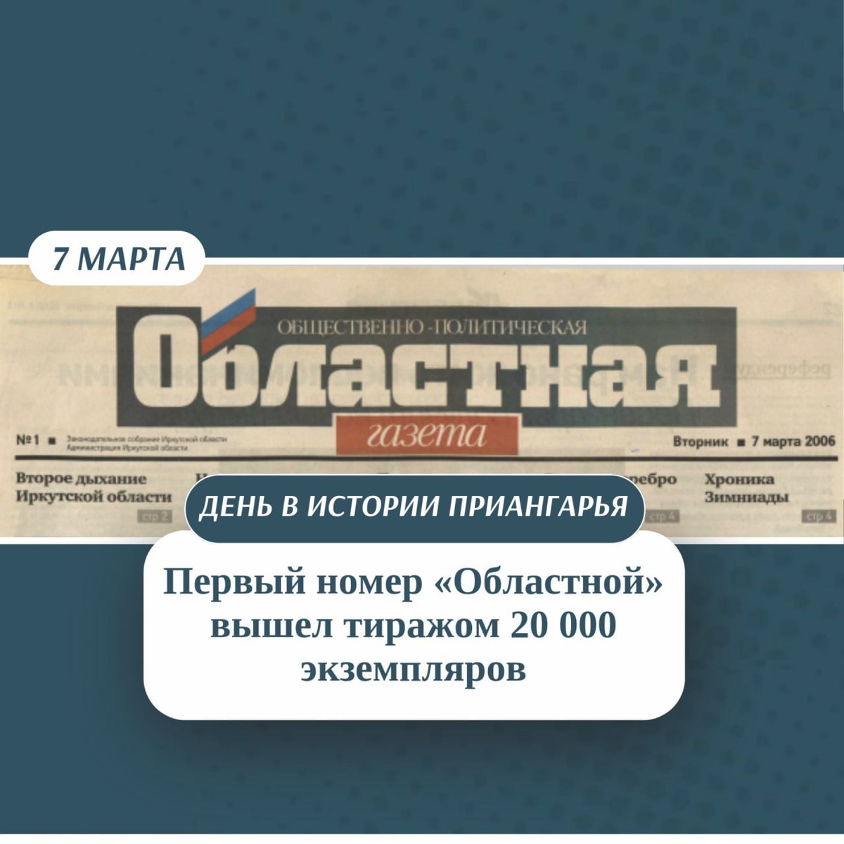 7 марта 2006 года вышел первый номер общественно−политической газеты «Областная» со стартовым тиражом 20 000 экземпляров ⭐️ «Областная» стала газетой, чьи новости ждали во всем Приангарье: общественно значимые материалы помогали жителям быть в курсе ключевых событий. Самые верные читатели с особой теплотой вспомнят одну из любимых рубрик — «Хорошая новость». Например, в знаковом для газеты, дебютном выпуске сообщили о необычном и радостном событии: рождении девочки с рекордным весом 5 660 граммов. В тот же период газета освещала и важные шаги в укреплении безопасности региона. Открытие лаборатории по анализу ДНК стало новым способом по борьбе с преступностью. Ярким событием культурной жизни стал фестиваль «Зимниада», который включил в себя 40 мероприятий. Визитной карточкой стал рекордный деликатес — сосиска длиной 18 метров, претендовавшая на попадание в Книгу рекордов Гиннесса. 🌐 Издание адаптировалось к цифровым реалиям, но сохранило свою миссию. «Областная» продолжает быть голосом