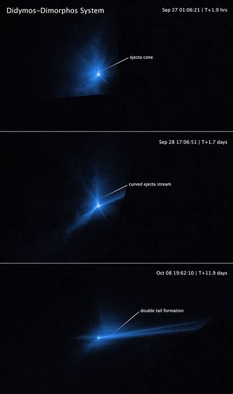 Один из самых важных результатов DART связан не просто с ударом как таковым, а с тем, что после столкновения из Диморфоса вырвалось огромное облако обломков и пыли. Именно этот выброс существенно усилил эффект. По оценкам исследователей, коэффициент усиления импульса оказался около двух. То есть астероид ответил на удар мощнее, чем если бы сработала только масса аппарата. Это один из ключевых выводов для будущей планетарной защиты.