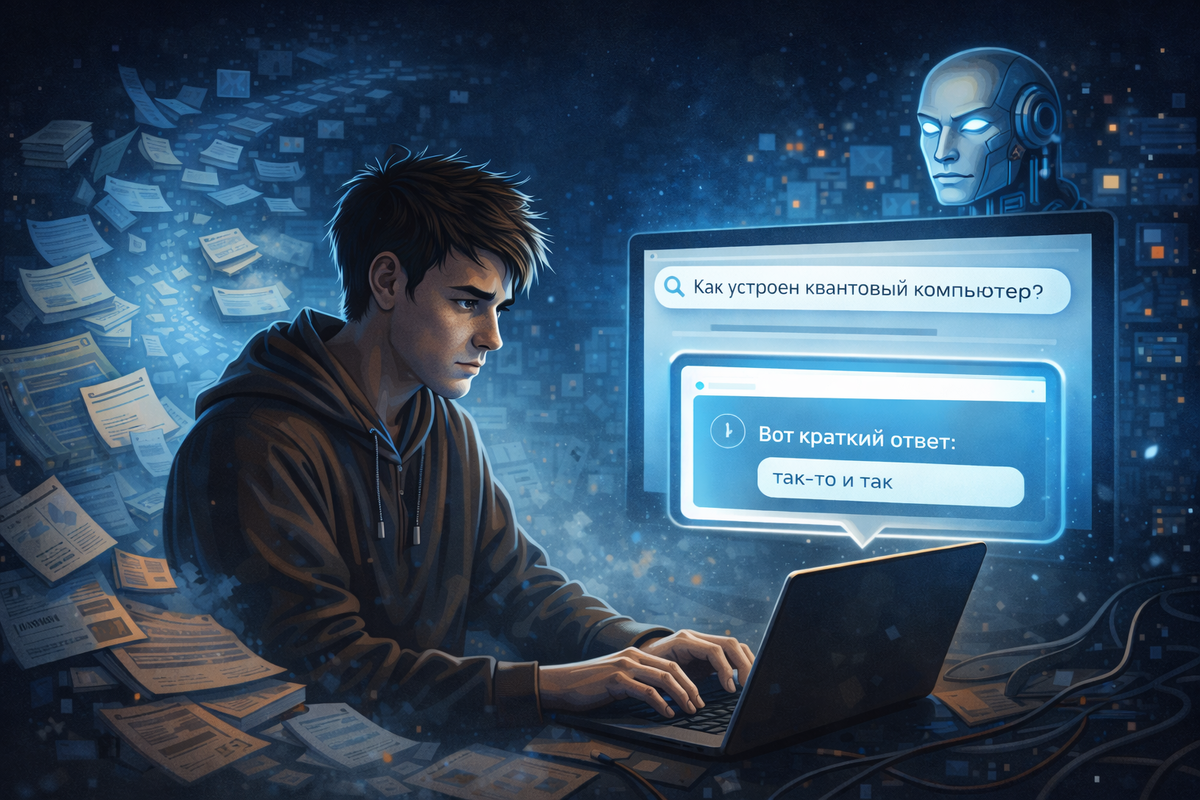Есть одна небольшая деталь, которая сильно изменилась за последние годы, но её редко замечают. Люди перестали искать ответы. Не потому что им стало неинтересно. И не потому что вопросы исчезли. Наоборот — вопросов стало больше, чем когда-либо. Просто изменился способ получения ответа. Раньше поиск выглядел как процесс. Человек открывал поисковик, переходил по ссылкам, читал форумы, сравнивал мнения, иногда натыкался на устаревшие советы и постепенно собирал картину. Это занимало время. Но вместе со временем появлялось понимание. Даже если ответ находился не сразу, человек начинал лучше ориентироваться в самой теме. Сегодня всё работает иначе. Ответ появляется почти мгновенно. Можно спросить ИИ, можно задать вопрос в чате, можно получить готовое решение в несколько строк. Технологии научились выдавать результат быстрее, чем человек успевает сформулировать проблему. С точки зрения удобства это почти идеальная система. Но вместе с этим исчезла одна важная часть процесса — путь. Когда отве