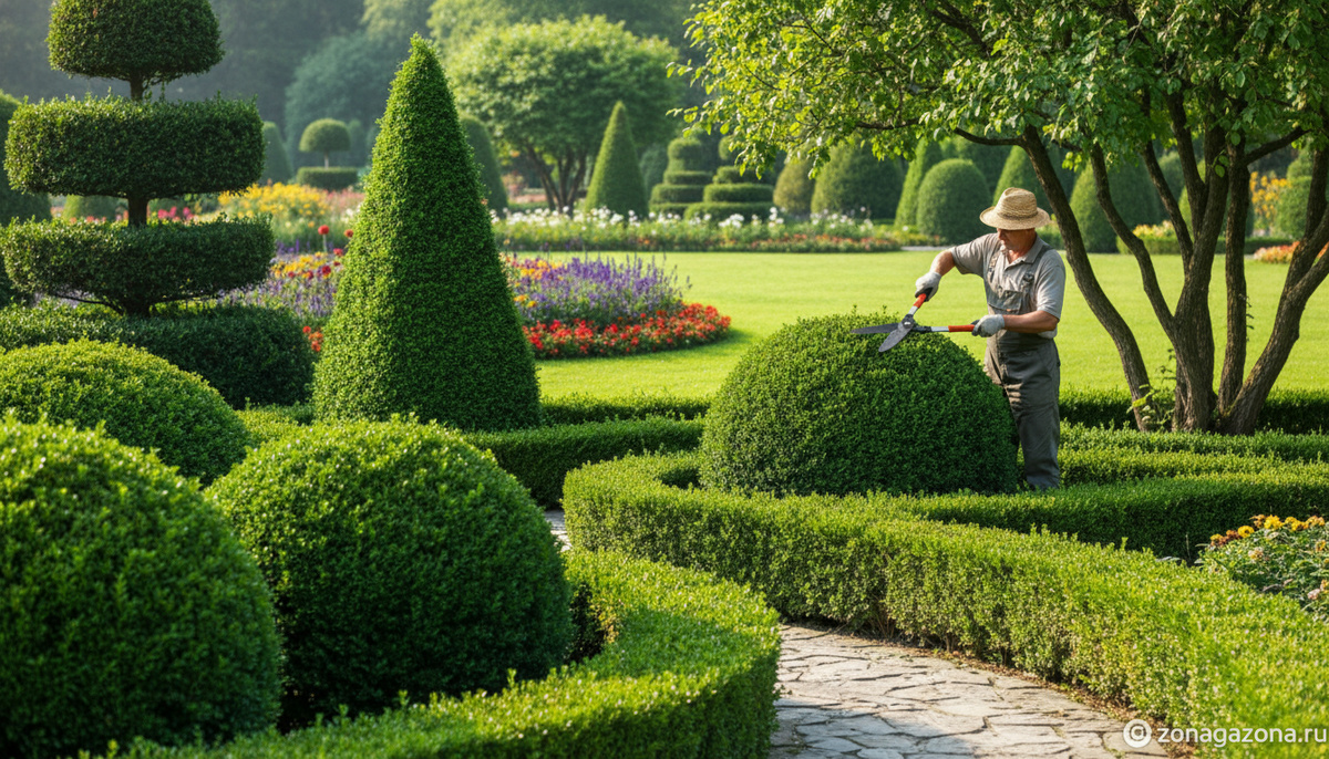 Здесь кустарник превращается в чёткую фигуру. Самые популярные формы — шар, куб, конус или колонна. Такие растения часто используют для оформления дорожек и входных зон.