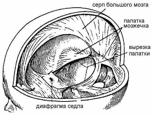 Намет мозжечка (tentorium cerebelli) расположен в горизонтальной плоскости. Он натянут между верхними краями пирамид височных костей и бороздой поперечного синуса затылочной кости, отделяя затылочные доли большого мозга от мозжечка.