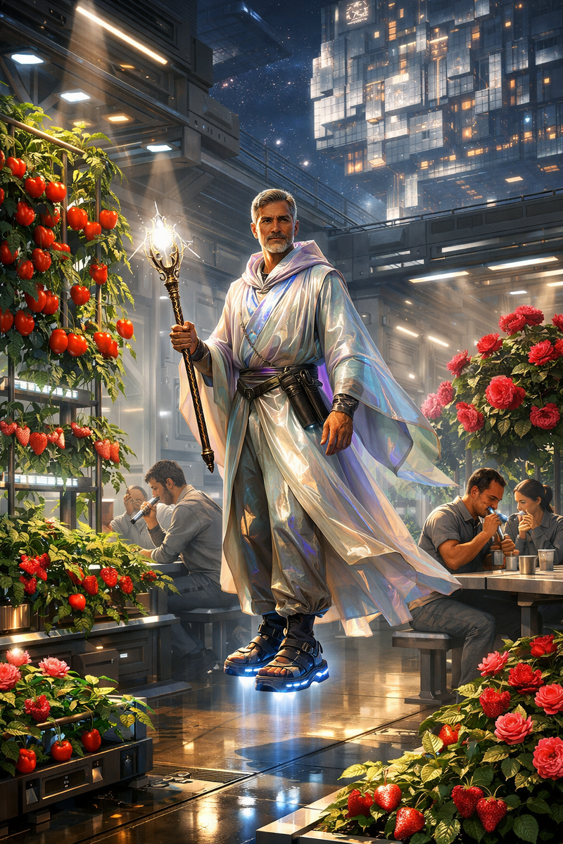 А Андрей в той реальности занимается невозможным. В летящем сквозь космос кубе, где нет ни грамма почвы, нет дождей, нет ветра, нет пчел — он выращивает ЖИВОЕ. У него есть тайная оранжерея, святая святых. Там под специальными лампами зреют помидоры — настоящие, красные, тугие, с пупырышками, пахнущие солнцем, которого здесь никогда не было. Там клубника свисает с кустов тяжелыми каплями, такая душистая, что голова кругом. Там розы — живые, трепетные, с бархатными лепестками, которые хочется трогать бесконечно.