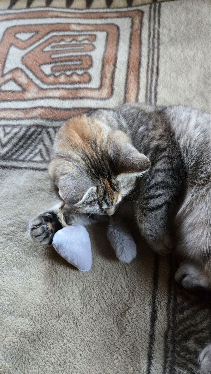Дочь привезла подарки зверюшкам и теперь Плутя играет в "Кошки-мышки".