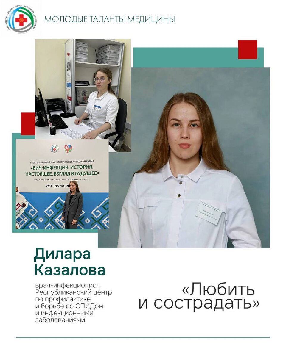 инфекционными заболеваниями Дилара Казалова. 🎓Дилара Кахромонжоновна с отличием окончила педиатрический факультет Башкирского государственного медицинского университета в 2021 году и начала свой путь врачом-стажером инфекционной больницы в Стерлитамаке. С 2024 года работает врачом – инфекционистом в РЦПБ со СПИДом и ИЗ. - На выбор специальности повлияло мое знакомство с профессором Диной Халимовной Хунафиной, по своему предмету профессор доносила информацию так, что я осознала важность инфекционного направления и особенно масштаб проблемы ВИЧ-инфекции. 📚В университете активно занималась научно-исследовательской работой. Была удостоена стипендии Главы Республики Башкортостан за выдающиеся способности и высокие результаты в учебной и научной деятельности. Участвовала и занимала призовые места во всероссийских, межвузовских олимпиадах по общественному здоровью и организации здравоохранения, истории медицины. 🩺Дилара Кахромонжоновна за короткий срок работы проявила себя активным со