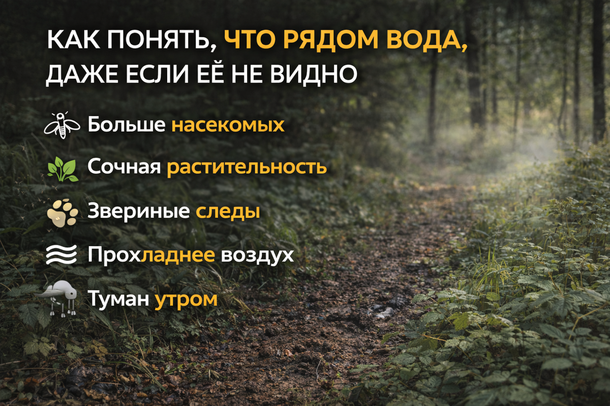 В лесу вода может находиться совсем рядом, но быть скрытой рельефом, кустарником или деревьями. Опытные туристы и охотники часто находят её по косвенным признакам.