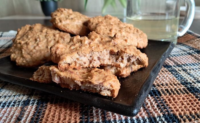 - орехи любые (1/2 стакана) Ну ладно, ладно, признаюсь. Я все смешивала "на глаз", а потом прикинула сколько чего ушло. И вы не смущайтесь, следуйте чутью и все получится. Эти печенюшки не кулинарный шедевр, а просто погрызть с чаем на радость диабетику. Овсяные хлопья я перемолола с помощью кофемолки, почти мука получилась Добавила молоко И горсточку целых хлопьев Все перемешала и оставила на полчаса.