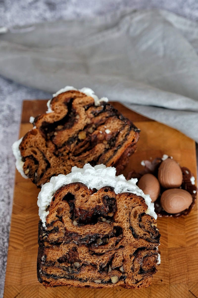 Краффин — гибрид слоёного круассана и маффина, в основе — сдобное дрожжевое тесто. Отличительная особенность — завитки теста, которые видны и снаружи, и в разрезе. Для этого тесто смазывают сливочным маслом, присыпают изюмом или сухофруктами, шоколадной пастой, а затем скручивают в улитку. Популярность коаффина как пасхальной выпечки, мне кажется, связана с тем, что он идеально подходит для формы