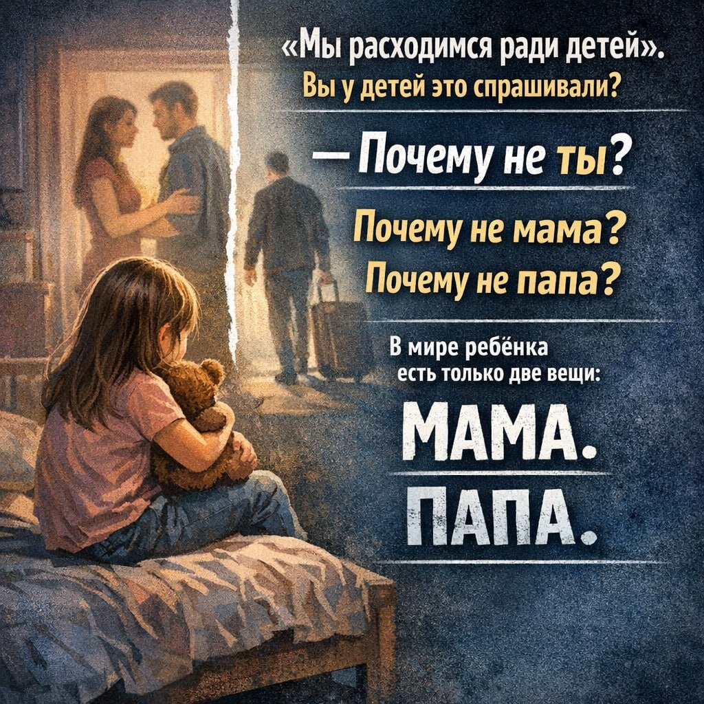 «Мы расходимся ради детей». Каждый раз, когда я это слышу, хочется задать один простой вопрос. Вы у детей это спрашивали? Вчера мы с дочкой разговаривали несколько часов. Не разговор. Вскрытие. Потому что дети не говорят о боли сразу. Они сначала пытаются понять взрослых. Представляете? Ребёнок сидит и пытается оправдать взрослых. Она говорила: «Наверное… люди расходятся…» «Наверное… так бывает…» А потом вдруг остановилась. И спросила. Очень тихо. — Почему не ты? Не «почему вы расстались». Не «почему так получилось». Нет. — Почему не ты? И вот тут взрослым становится неудобно. Потому что в мире ребёнка нет ваших сложных оправданий. Нет: «новый партнёр» «мы остались друзьями» «так сложилась жизнь» Это всё взрослая словесная терапия, чтобы не чувствовать последствия своих решений. В мире ребёнка есть только две вещи. Мама. Папа. И всё. Там не существует «другого папы». Это примерно как сказать ребёнку: «Слушай, у тебя теперь новое солнце. Привыкай». И ребёно