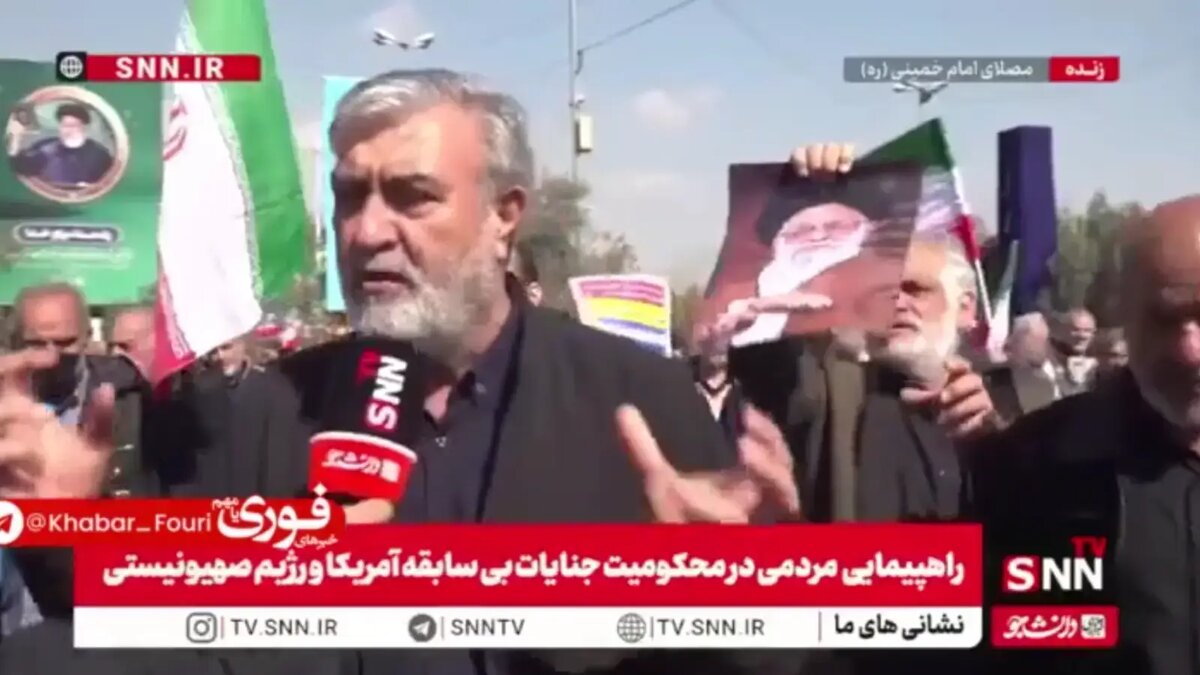 На видео видны кадры репортажа и шумная атмосфера на площади — чувствуется напряженность ситуации. В этом контексте приводится резкое заявление главы Комитета по национальной безопасности парламента Ирана Ибрахима Азизия.