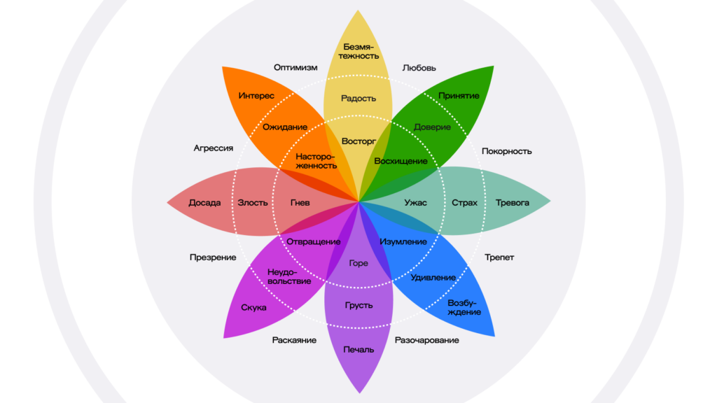 - Основа колеса — восемь базовых эмоций, из которых складываются более сложные переживания.