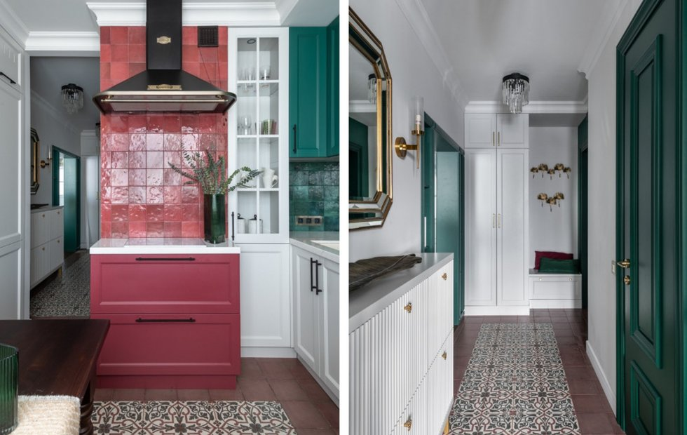 В этой квартире продумано все до мелочей Место: Москва Тип дома: КОПЭ Метраж: 75 кв. м Комнаты: 3 Cанузлы: 2 Дизайн: Вера Шеверденок Стилист: Е.Мельникова, И. Бебешина Фото: Евгений Гнесин Дизайнер Вера Шеверденок оформила квартиру в доме серии КОПЭ без перепланировки. Ей удалось разделить детскую, увеличить рабочую зону на кухне, скрыть двери в гостиной и организовать много мест хранения. Получился яркий интерьер в современном стиле с интересными решениями. В домах серии КОПЭ невозможно сделать перепланировку, так как все стены панельные. При этом вход в жилые комнаты находится в гостиной. Самую большую комнату отдали под детскую, чтобы разместить в ней двух сыновей. Рядом — спальня родителей. В кухне есть вентиляционный короб, который затрудняет расстановку мебели. Дизайнер предложила разместить в этом месте варочную панель на две конфорки, выделив эту зону ярким малиновым цветом. А в шкафу около окна удалось разместить стиральную и сушильную машины. Это помимо колонн с бытовой те