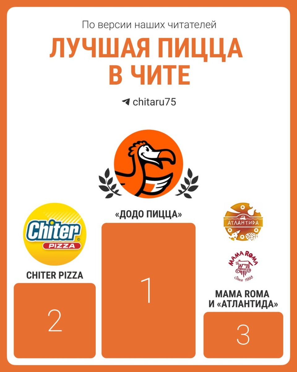 ! У пиццерий развернулась настоящая битва за любовь читателей @chita.ru, но лидер определился сразу. В итоге, набрав 47% голосов, победила «Додо Пицца». На втором месте — Chiter Pizza, а третье место с одинаковым количеством голосов разделили Mama Roma и «Атлантида». 🟦 Перейти в MAX