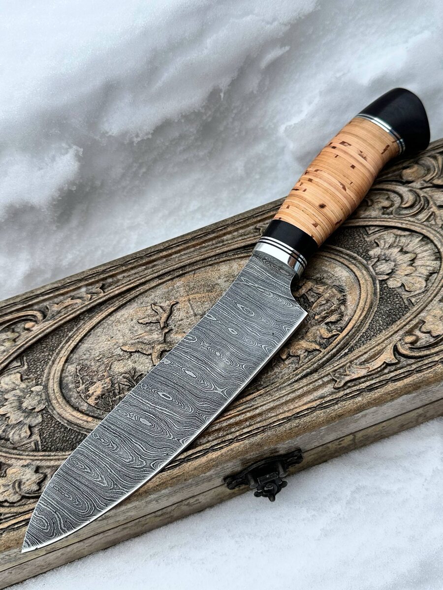 ! Кухонный шеф-нож №8 из дамасской стали (950 слоёв) 🔪 Идеален для кухни ценителя: - Клинок — дамасская сталь в 950 слоёв, выдаёт потрясающий рез и прочность - Полные спуски от обуха — режет продукты без малейшего сопротивления - Заточка до бритвенной остроты - Твёрдость — 62 HRC, держит заточку долго - Рукоять из натуральной бересты — удобно лежит в руке, не скользит даже во влажных условиях - Стиль и традиции — ручная работа, мастерство 3-го поколения - Пожизненная гарантия на отсутствие производственных дефектов В комплекте: ✅ Кожаные ножны 🔺 Хотите эксклюзив? Сделаем формованные ножны (+8 000 ₽) 💰 Цена: 9 810 рублей Кому подойдёт: - Профессиональному повару — для ежедневной работы - Любителю порадовать семью и гостей - В подарок ценителю качественных вещей --- ⚡️ Заказывайте прямо сейчас: 📲 Пишите в Telegram: [@Nazarklinokbot](https://t.me/Nazarklinokbot) 📞 WhatsApp/Viber: [ +79101343831 ](https://wa.me/79101343831) 💬 Задавайте вопросы! Подберём нож под ваши задачи.