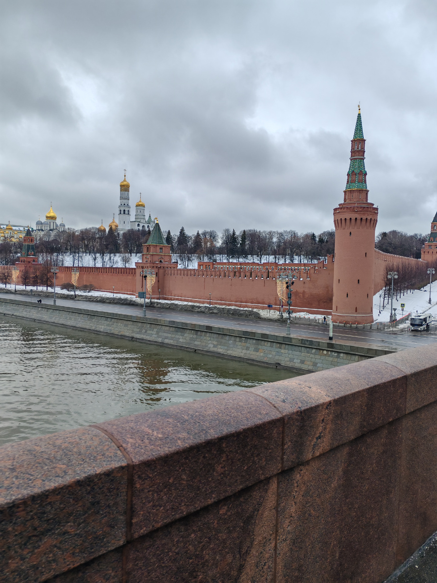 Довелось на днях пройтись по Большому Москворецкому мосту. Хоть и слякотная 5 марта была погода, но вид с него открывается красивый. Даже в хмурую погоду, в черно- белых сугробах.
