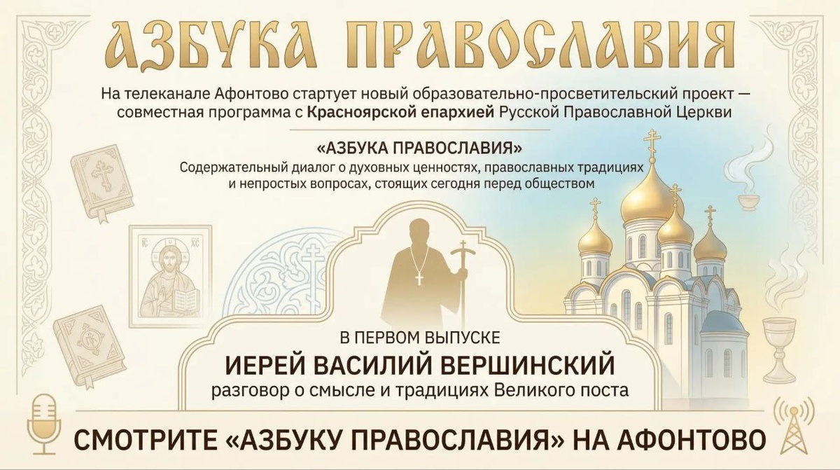 На телеканале Афонтово стартует новый образовательный и просветительский проект «Азбука православия» — совместная программа с Красноярской епархией Русской Православной Церкви. Это новый формат для открытого и содержательного диалога о духовных ценностях, православных традициях и непростых вопросах, стоящих сегодня перед современным обществом. Здесь каждый зритель, вне зависимости от возраста и взглядов, сможет найти ответы на важные жизненные вопросы и почувствовать поддержку. В первом выпуске — разговор о смысле и традициях Великого поста: зачем православные его соблюдают, как поститься с пользой для души и как правильно находить силы для духовного обновления. Смотрите «Азбуку православия» на Афонтово — чтобы лучше понять себя, близких и окружающий мир. Подписаться на МАХ-канал Афонтово