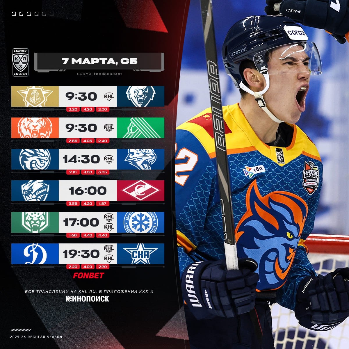 «Драконы» в Шанхае примут «Барыс» в рамках #KHLWorldGames, СКА заглянет в гости к московскому «Динамо».