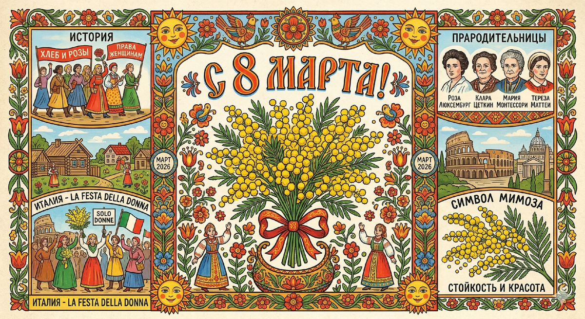 8 Марта — это не просто календарная дата, знаменующая приход весны, а грандиозный фестиваль жизни, в котором переплелись борьба за права, социальный триумф и неповторимая эстетика женского вдохновения. В 2026 году этот праздник окончательно перерос рамки «дежурных букетов» и превратился в настоящий манифест радости, свободы и созидания 🌟. Чтобы прочувствовать его магию до конца, мы совершим путешествие от легендарных маршей Нью-Йорка до залитых солнцем площадей Рима, где воздух буквально пропитан пьянящим ароматом мимозы 🇮🇹💛. Сегодня традиции солнечного Лацио и наследие великих женщин — от пламенной Розы Люксембург до мудрой Марии Монтессори — сливаются в единый поток, напоминая нам: 8 Марта — это символ невероятной силы, которая делает наш мир прекрасным, сохраняя в нем свет и гармонию.