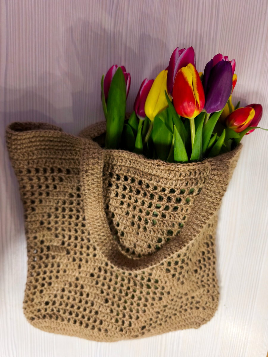 Средний шоппер из джута можно связать довольно быстро. Обычно на такую работу уходит от одного до трёх вечеров, в зависимости от плотности вязания и опыта.