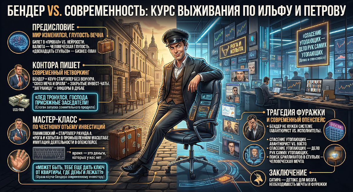 Как Ильф и Петров предсказали экономику 2026 Мир изменился, но человеческая глупость — это единственная твердая валюта, не подверженная инфляции. Мы живем в эпоху нейросетей и бесконечных созвонов в Zoom, но стоит открыть «Двенадцать стульев», как понимаешь: за сто лет ничего не поменялось, кроме фасона брюк. Илья Ильф и Евгений Петров написали не просто сатиру, а детальный бизнес-план по выживанию в мире, где здравый смысл считается дурным тоном. Это литература, которая кусается, и ее укус гораздо полезнее, чем любые курсы по «успешному успеху». Контора пишет, или Специфика современного нетворкинга Если вы думаете, что «Союз меча и орала» остался в прошлом, значит вы давно не заглядывали в закрытые чаты для инвесторов. Сегодняшний Остап Бендер не бегает по Старгороду, он продает токены и обещает иксы. Его классическое: «Лед тронулся, господа присяжные заседатели!» — это ведь идеальный слоган для любого сомнительного запуска продукта, когда фаундер сам не понимает, что именно он запуст