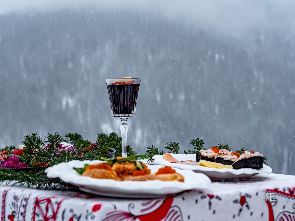 Этот кадр снят на склоне горы Сарлык. Внизу — Шерегеш и склон горы Зеленая, вокруг — снег, ветер и облака, которые закрывают вершины. На фоне почти монохромного зимнего пейзажа появился неожиданный контраст: бокал вина, горячая еда, еловые ветки и скатерть, накрытая прямо на снегу. Иногда для небольших групп в горах устраивают выездной кейтеринг. Несколько минут остановки между спусками — и среди снега появляется аккуратно сервированное место. В тот момент продолжал идти снег, гора Зеленая растворялась в тумане, а бокал темного вина оказался самым ярким элементом во всем пейзаже. #Шерегеш #горы #фотография #хроника #ЕвгенияЯблонская