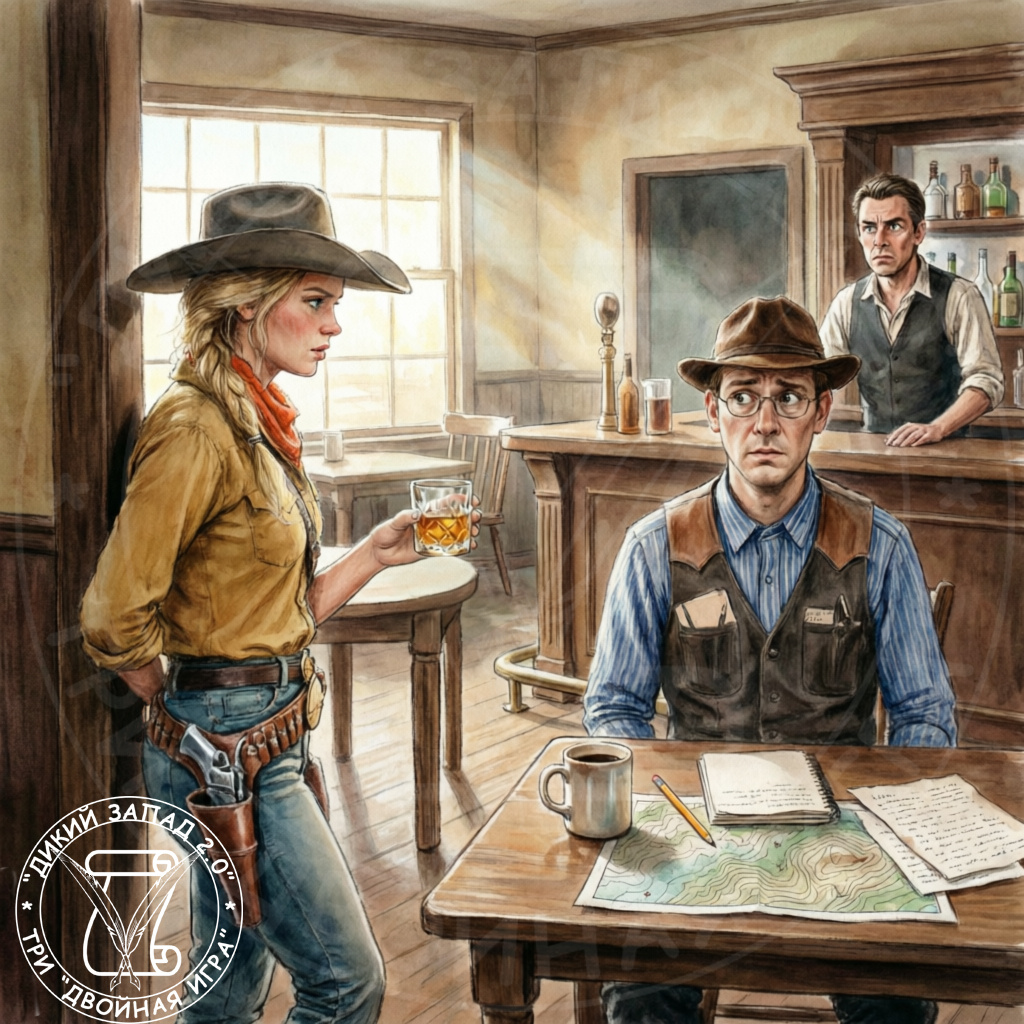 Утреннее солнце резало глаза, пробиваясь сквозь запыленные окна салуна. Воздух еще пах вчерашним табаком и кислым пивом, но к ним уже примешался аромат свежесваренного кофе. Я занял свой привычный столик в углу, спиной к стене, положив на деревянную столешницу свернутую карту и записную книжку, подписанную моим именем - Ридлик. Заказал кофе и яичницу. Тишина была звенящей, почти неестественной после вечернего гула.