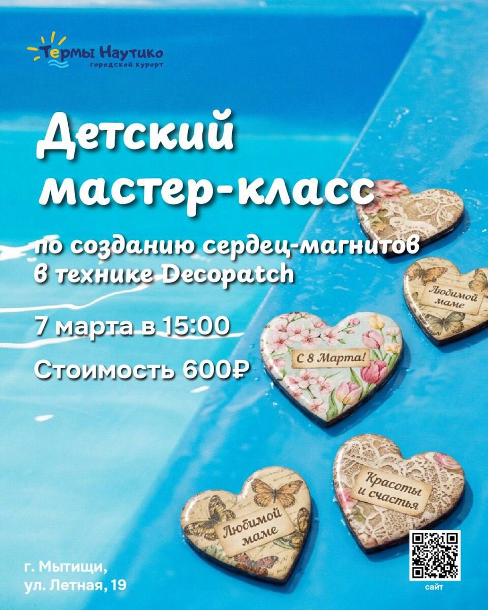 ! С радостью напоминаем, что уже сегодня в нашем комплексе состоится детский мастер-класс по созданию очаровательных сердечек-магнитов в технике Decopatch 💖 Юные участники смогут своими руками сделать красивый и душевный подарок для самых любимых — своих мам. Это прекрасная возможность проявить фантазию, творчество и подарить частичку тепла к празднику! Стоимость участия — 600 ₽. Будем рады видеть вас! ✨
