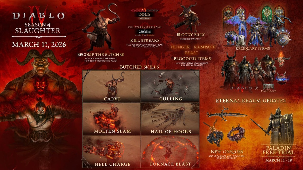 • Дадут поиграть за того самого Мясника с уникальными способностями. Собираешь мясо, относишь к алтарю и устраиваешь REZNYA. • Кроссовер с Doom: The Dark Ages — добавят много тематической косметики и скины. • Дадут поиграть за новый класс Паладин, но только тем, кто предзаказал Lord of Hatred. Старт сезона — 11 марта 🎮 Crunch'N'Play 🎮 В этом посте есть большое видео, которое не загрузилось в Дзен. Откройте оригинал поста в телеграме, чтобы его посмотреть