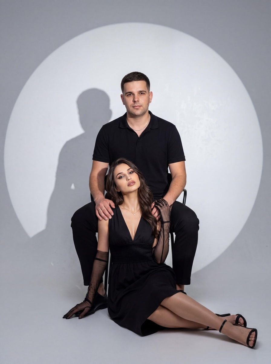 🤖Генерировать можно здесь: 👉БОТ ДЛЯ ГЕНЕРАЦИИ Режим Nano Banana 2/Pro ИНСТРУКЦИЯ Пара в стильных черных нарядах на светло-сером студийном фоне с ярким круглым световым пятном. Молодой мужчина с загруженного фото. Черты лица, форма глаз, цвет волос и общий облик мужчины строго перенесены с загруженного референсного фото - точное сходство обязательно. Одет в черную рубашку-поло и черные брюки. Он сидит на простом черном стуле, его взгляд уверенный и прямой, направлен в камеру. Перед ним на полу сидит молодая девушка с загруженного фото. Черты лица, форма глаз, цвет волос и общий облик девушки строго перенесены с загруженного референсного фото - точное сходство обязательно. Она одета в элегантное черное платье с глубоким вырезом, прозрачными перчатками до локтя и черными босоножками на высоком каблуке. Ее поза чувственная и расслабленная, ноги вытянуты в сторону. Она смотрит в камеру с томным, соблазнительным выражением лица. Руки мужчины лежат на ее плечах, создавая ощущение связи и