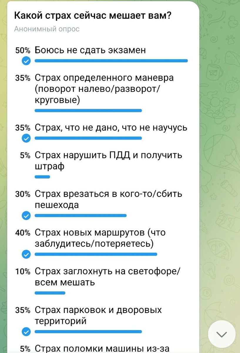 ! ☝️😮 Привет, друзья! 👋 Посмотрите на скрин опроса, который я проводил ранее 👆: 50% боятся не сдать экзамен, 40% — новых маршрутов, 35% — парковок (отмечать можно было несколько вариантов). Цифры серьезные, и я прекрасно понимаю эти страхи. Сам каждый день вижу учеников, которые переживают из-за левых поворотов, круговых или теряются во дворах. Но давайте честно? Я просто делюсь своим наблюдением, которое заставляет задуматься. Мне часто пишут: "Не получается парковаться", "Боюсь разворота", "Теряюсь в потоке". Отлично, проблема ясна. И у неё есть куча решений: 1️⃣. Взять занятие у инструктора и проработать только тот элемент, который вызывает трудность. 2️⃣. Если не нашли общий язык — поискать другого инструктора. Не бойтесь менять специалистов, пока не почувствуете прогресс (это в первую очередь нужно вам). 3️⃣. Посмотреть бесплатные разборы в интернете. 4️⃣. Просто брать машину и практиковаться самостоятельно (либо с кем-то рядом), набивать руку. Вариантов — вагон. 😁 И чт