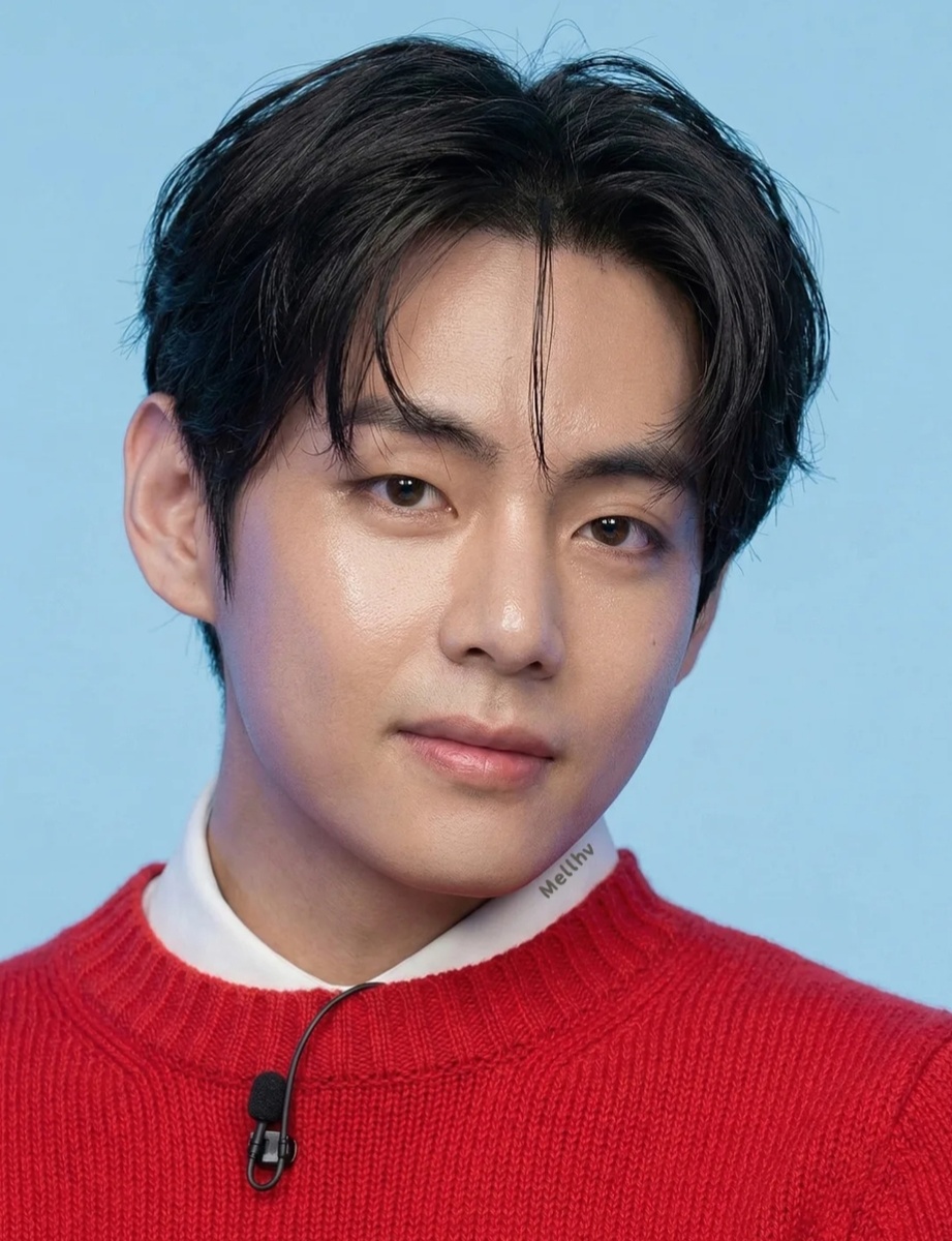 Этот свитер подчеркивал теплоту его кожи, глубину темных глаз и какую-то особую, почти осязаемую энергию. Тэхён в красном — это всегда «опасно» для наших сердец, но вчера это было еще и невероятно уютно. Это был образ «мягкой силы»: он мог просто молчать, но его присутствие заполняло всё пространство.