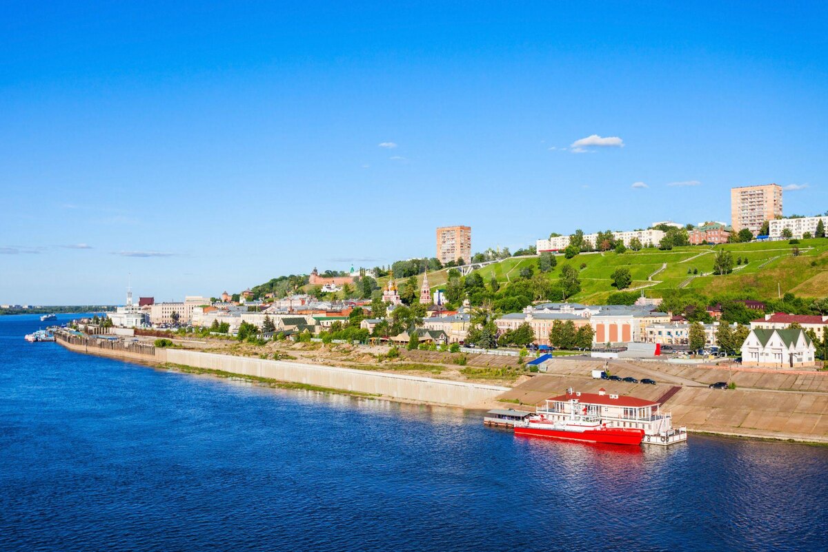 Вид на реку Волгу и речной вокзал в Нижнем Новгороде. Источник: Shutterstock