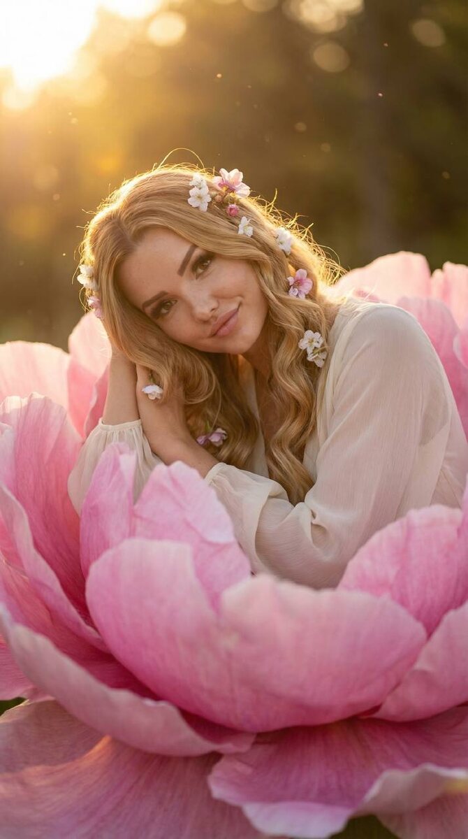 🤭🫶 Medium shot, slightly high angle, captured with an 85mm lens. A young woman with luminous fair skin and long, wavy golden blonde hair, adorned with delicate white and pink flowers, reclines gracefully within a large, vibrant rose pink peony. She wears a flowing, ethereal dress of sheer pale ivory silk chiffon, with loose sleeves and a layered, petal-like skirt. Her pose is serene, knees bent, one arm resting under her head, the other near her chest, with a gentle smile and soft, inviting eyes looking directly at the viewer. Soft, warm golden hour backlight from the upper left creates luminous rim lighting on her hair and the peony petals, complemented by a diffused front fill light, casting subtle, soft shadows. The background features blurred, muted olive green foliage and hazy golden light with subtle sparkling dust motes and out-of-focus pink floral shapes, creating a creamy bokeh. The harmonious pastel color palette, dominated by soft rose pink, pale ivory, and warm golden to