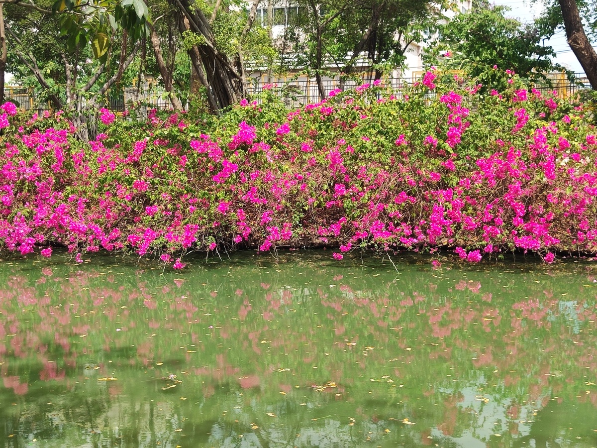 Следующее место для отдыха мы выбрали на берегу неширокой речки. Весь противоположный берег зарос цветущими бугенвиллиями.