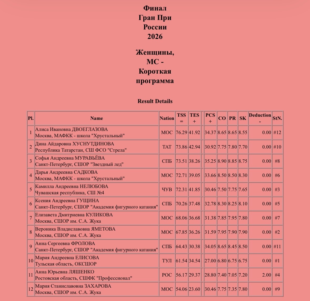 По итогам коротких программ промежуточная турнирная таблица выглядит следующим образом.