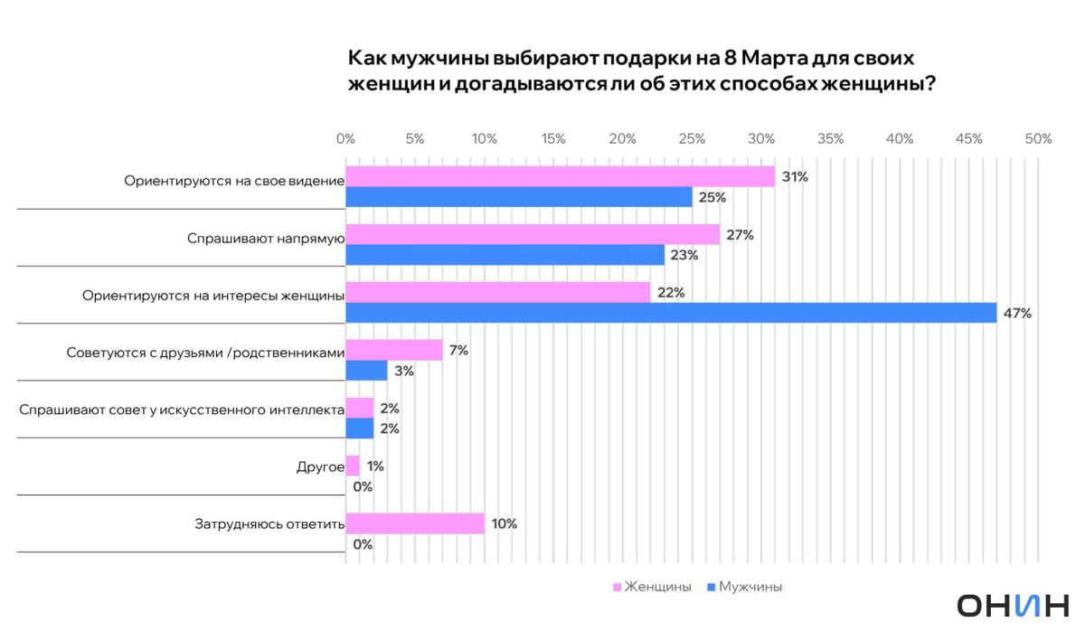 Мы спросили: «Чего хотят женщины?» и «Что готовы сделать мужчины?». А затем — пошли дальше: изучили, что делает женщин счастливыми не только в праздник, но и в повседневной жизни. ➡️ ЧИТАТЬ СТАТЬЮ ...47% мужчин уверены: при покупке подарка они ориентируются на интересы и предпочтения своих дам. Однако женщины видят ситуацию иначе: лишь 22% считают, что мужчины действительно учитывают их мнение.... ...Для женщин важнее не категория подарка, а то, насколько он отражает внимание к их личности. Мужчина может искренне считать, что дарит «то, что нужно», но не попадать в эмоциональный запрос.... ...Чувство защищённости и финансовая стабильность — 32% Базовая потребность, которая с возрастом становится только важнее. При этом желание чувствовать себя в безопасности одинаково значимо для всех возрастных групп.... 📎 На основе исследования компании ОНИН
