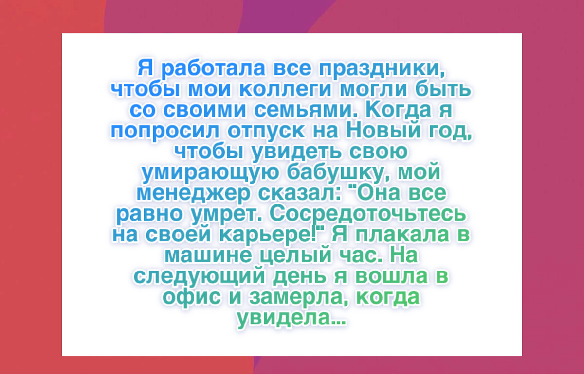 “Я работала во все праздники, чтобы коллеги могли проводить время со своими семьями. Но однажды мне самой понадобился выходной на Новый год. Моя бабушка умирала, и я хотела увидеть ее в последний раз. Менеджер сказал мне холодно: «Она все равно скоро умрет. Сосредоточься на карьере». Я сидела в машине и плакал почти час. На следующий день я пришла на работу и увидела в комнате отдыха новое расписание на стене. Все мои коллеги добровольно взяли мои смены. Внизу кто-то написал: «Поезжай к бабушке. Мы все закроем».”