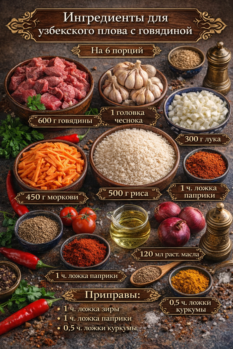 💡 Совет: тщательно промойте рис перед приготовлением — тогда плов получится рассыпчатым.