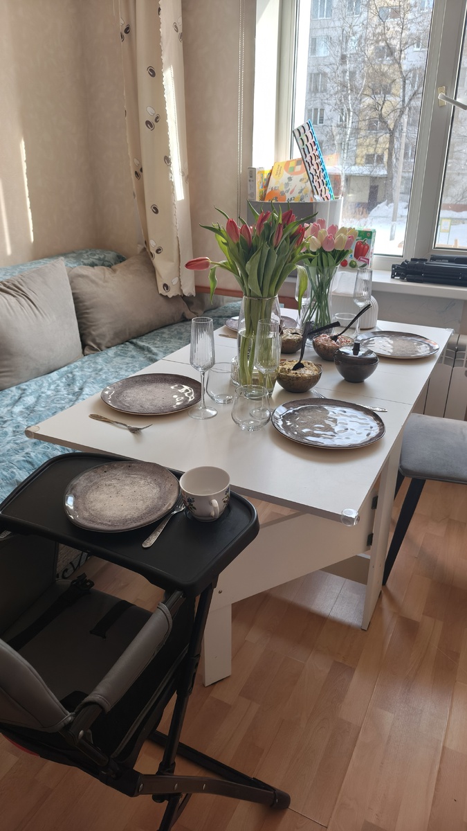 Привет! Меня зовут Настя и я мама гиперактивного ребенка. Добро пожаловать в мой блокнот. Дневник о прошедших буднях можно почитать тут: Сегодня 7 марта, а день начался очень рано. В 6 меня разбудил Серёжка, стал жаловаться на плохое самочувствие. Начинается... Позже встал и сынок, так что в 7 мы уже во всю бодрствовали. Покормила завтраком, попила кофе и продолжила работу над новым роликом. Параллельно занималась уходом за лицом, что бы время не терять. В 9.30 Серёжка побежал в табачную палатку, заолно встречать свою маму и тётку. Я же подготавливала и накрывала на стол, марафетилась, переоделась и Женьку переодела. Серёжка мне вчера притащил букет красных тюльпанов 🥰 Вкусно так пахнет! На стол подавала все покупное, время на готовку не было совсем. Три вида салата, отварную картошку (ее мне пришлось доделывать, запекая в духовке и заправлять сливочным маслом, солить). К ней была селёдочка с луком и селедочная икра. Из напитков поставила яблочный сок и безалкогольное шампанское розов
